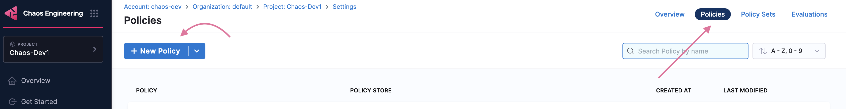 To apply an OPA policy to your pipeline, go to Chaos module -> Project Settings. Under Security and Governance, select Policies.
