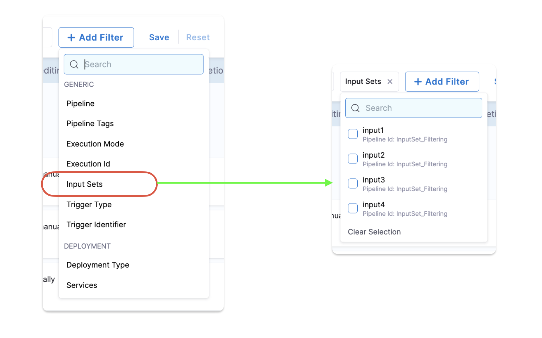 • You can filter pipeline executions by input set name using the Search filter in the Execution History page.