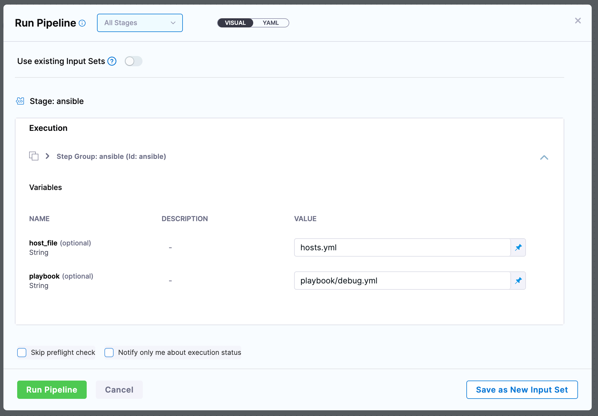 If you have ansible variables you want set on every run, but want to have them as pipeline inputs, you can again create a step group variable for this, and add them into your ansible command: